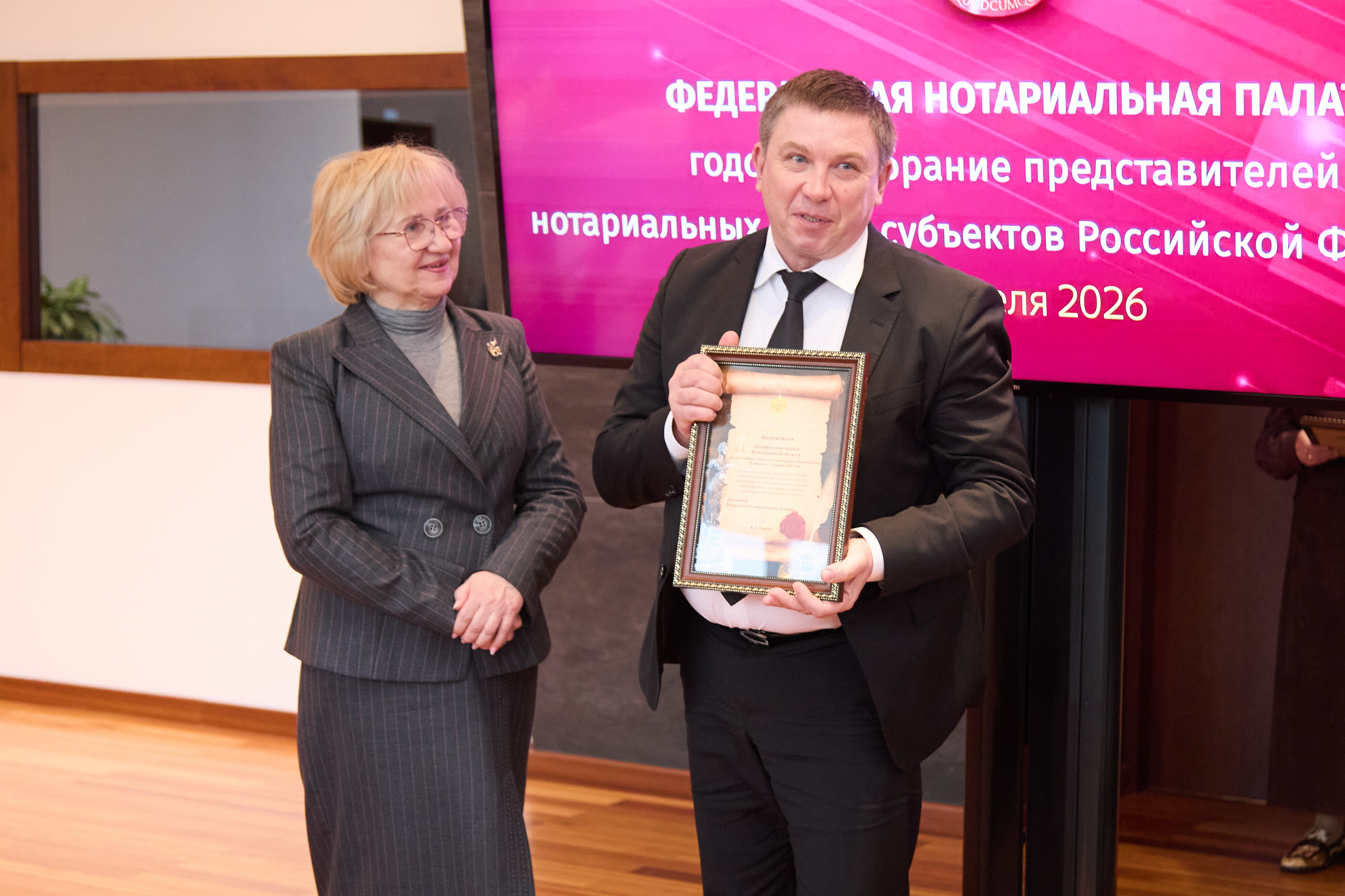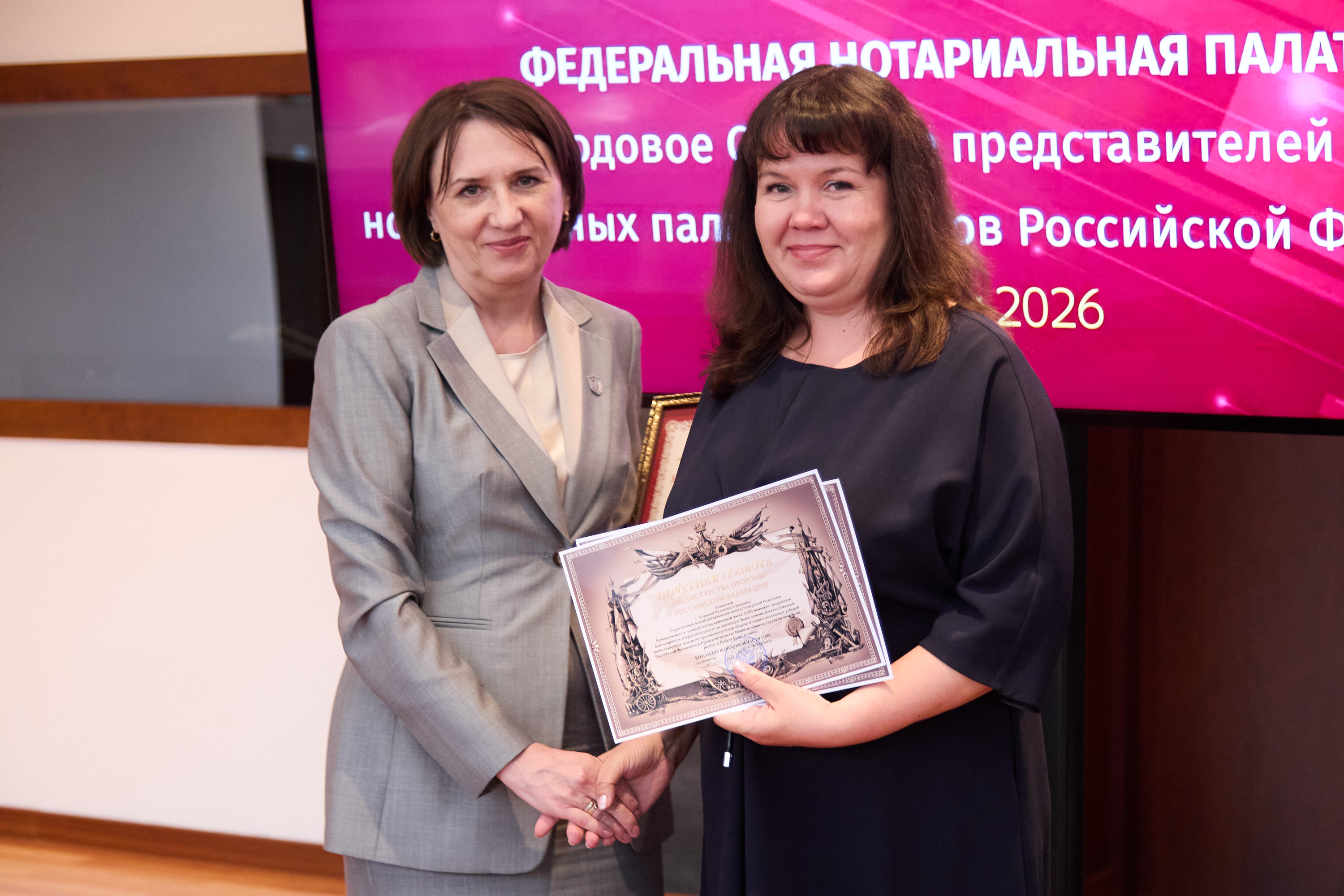 Завершающей частью мероприятия стала церемония награждения. Почетной грамотой ФНП за вклад в развитие российского нотариата были награждены члены Правления ФНП состава 2019-2026 гг.: Наталья Гончарова, Светлана Зылевич, Александра Игнатенко, Кирилл Лазорин, Галина Николаева, Мария Терехова, Марина Эдельштейн.